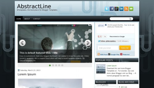 AbstractLine es una plantilla blogger con 2 columnas, barra lateral derecha, las columnas de pie de página, presentación de diapositivas, iconos de marcadores sociales, abstractas, degradados y elementos vectoriales.