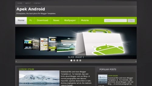 La plantilla en cuestión se llama Apek Android, es una plantilla blogger con 2 columnas, barra lateral derecha, slider superior que presenta en forma de diapositivas los posts, leer más con imágenes en miniaturas y menú superior con pestañas desplegable.