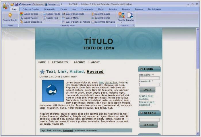 Con Artisteer podrás crear atractivos diseños, así como ajustar los diseños ya generados gracias a los diferente elementos que se incluyen, botones, fondos, objetos fotográficos, crear código profesional al tiempo que compatible con HTML y CSS, podrás también exportar tu diseño para crear diseños atractivos para tus webs y/o blogs.