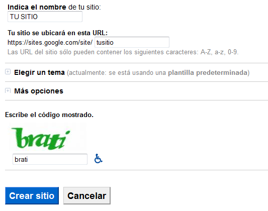 1. Vamos a Google Site,estando alli damos click en «Crear un sitio nuevo».Rellenas todos los campos que te piden y das click en Crear sitio.