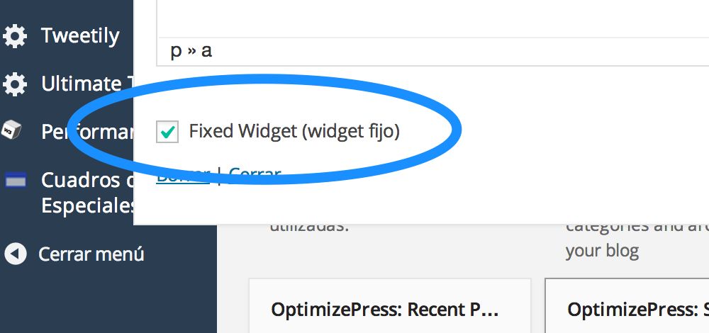 El plugin está en español por lo que su configuración es realmente fácil, luego de activarlo solo debes ir a Apariencia, Widgets, seleccionar el gadget que quieres que quede fijo y al final de la caja de edición aparecerá la casilla Fixed Widget que deberás activar, luego guardas los cambios y listo.