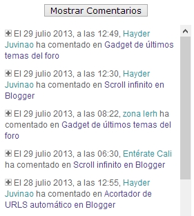 En otras ocasiones ya he publicado gadgets de últimos comentarios para Blogger, pero el truco de hoy viene con algunas cosas adicionales, trae la fecha, hora, el nombre del usuario que comento y el nombre de la entrada, además al hacer clic en el pequeño icono de la cruz se ve el comentario completo, evitando que tengamos que ir a la entrada para ver el comentario completo.