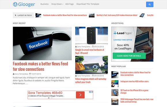 Glooger es un tema de uso múltiple para Blogger diseñado para revistas en línea, blogs de tecnología, blogs de recetas de comida, noticias y empresas editoriales. Glooger tiene un diseño sensible, único y moderno. El diseño se adapta a diferentes tamaños de pantalla que hará que su sitio web sea compatible con todos los dispositivos tales como teléfonos inteligentes, tabletas, ordenadores portátiles o computadoras de escritorio. Construido con los últimos estándares de codificación y diseño limpio, el tema se prevé para ofrecerle a largo plazo una potente solución para proyectos en línea.