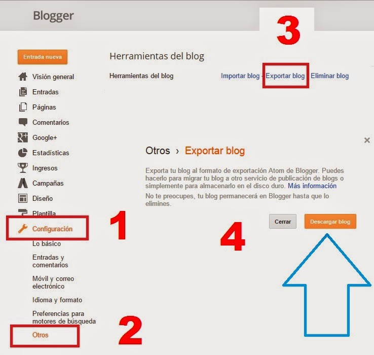 Tienes que ir a Configuración, Otros, Herramientas del blog, Exportar blog, Descargar blog.