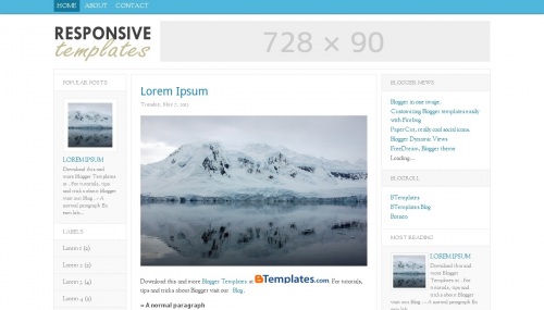 ResponsiveT es una plantilla para blogger, la cual fue adaptada de WordPress, tiene 3 columnas, diseño sensible , barras laterales izquierda y derecha, mirada fresca y minimalistas, anuncios listos, paginación y colores neutros.